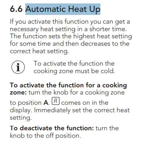 - All cooking zones are equipped with an automatic warm up function When setting a heat setting using ( + ) when starting from ( 0 ), the cooking zone switches to full power for a certain amount of time and then automatically switches back to the heat setting set.