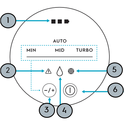 The water droplet icon (4) informs you that the mop nozzle is connected, and the mopping function is available (the main motor does not turn on then).